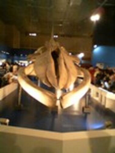 と言うことで、写真はシロナガスクジラの骨を正面から見たところ。 息子の行動を監視していたので、展示はあまり見なかったな。 小さな子どもが、展示が骨ばっかりなので、泣いていたっけ。 海の生き物は謎が多い、ということはよくわかった。クジラの新種が…
